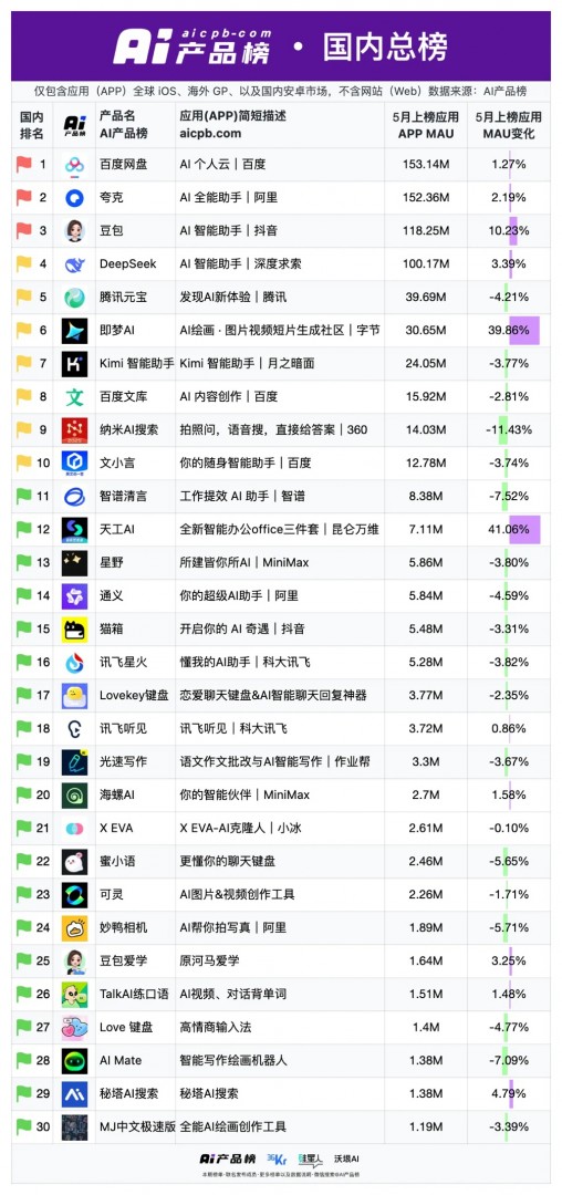 最新数据显示,百度文库AI MAU已达9700万,拥有14亿专业内容资源;在最新发布的5月AI产品榜上,百度网盘APP MAU超1.5亿,位列应用榜国内总榜第一。