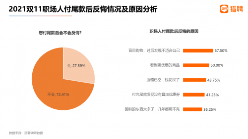此次调研显示,69.88%的职场人表示自己是尾款人,其中78.97%的职场人表示自己会为了付尾款而熬夜。在付尾款的人中,有27.59%的职场人付款后反悔,其首要原因是“盲目购物,过后发现不适合自己”,得票率为57.5%;排名第二及第三的原因是“看到更优惠的商品”“血槽已空,钱花没了”,得票率为50%、43.75%。