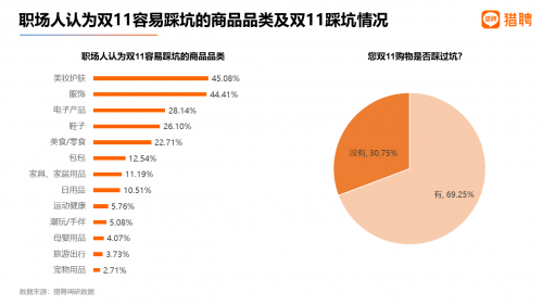 在本次调研中,职场人认为双11购物容易踩坑的商品品类排名前三的是美妆护肤、服饰、电子产品,得票率分别为45.08%、44.41%、28.14%。而在实际购物中,69.25%的职场人表示在双11中踩过坑。