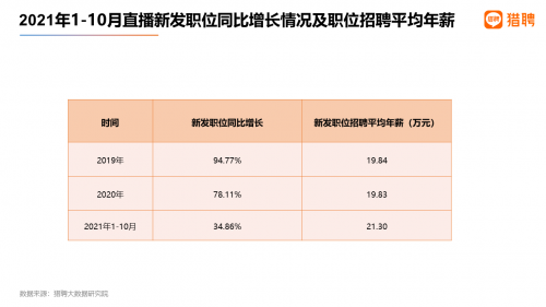 自从直播带货兴起后,直播也成为与双11不可或缺的因素。猎聘大数据显示,2021年1-10月直播新发职位同比增长34.86%,远远高出电商新发职位同比增速(2.29%)。而同期的电商新发职位招聘平均年薪则明显高出直播,为24.15万元,比直播高2.85万元。