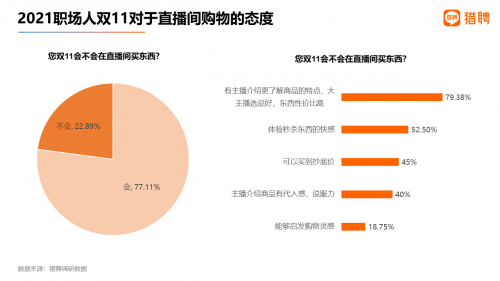 77.11%的职场人表示会在直播间买东西,而有77.11%的职场人表示会在直播间买东西,六、双11近8成职场人在直播间购物 随着直播的兴起。
