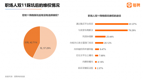 在踩过坑的职场人中,42.71%的人表示没有选择维权。“通过购买平台投诉”、“与卖家协商解决”是职场人双11消费踩坑最重要的两大维权途径,得票率分别为81.07%、79.29%;“找消协调解”、“向相关行政主管部门投诉”排名第三和第四,得票率分别为25.44%、20.12%。