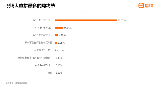 在“哪个购物节买的东西最多”问题的答案中,双11以78.87%的得票率位居第一;618、双12分别以10.56%、4.23%的得票率位居第二、第三。由此可见,尽管购物节繁多,但双11仍然稳稳占据了职场人的心智。