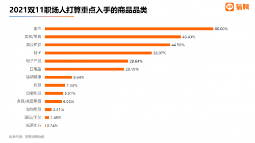 从今年双11职场人打算重点入手的商品品类来看,排名前四的分别是服饰、美食/零食、美妆护肤、鞋子,得票率为60%、48.43%、44.58%、38.07%。