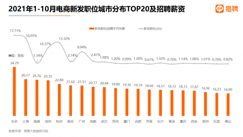 从2021年1-10月电商新发职位占比最高的前20城市来看, 北京、上海占比为17.71%、16.05%;杭州、深圳位居第三、第四,占比为13.32%、10.37%,广州以8.04%的占比位居第五,其他城市均低于3%。从企业新发职位招聘平均年薪为来看,北京最高,职位招聘平均年薪为34.79万元,上海、南昌、深圳、杭州新发职位平均年薪位居第二至第五,为26.17万、25.76万、25.35万、22.80万,其他城市均低于22万。
