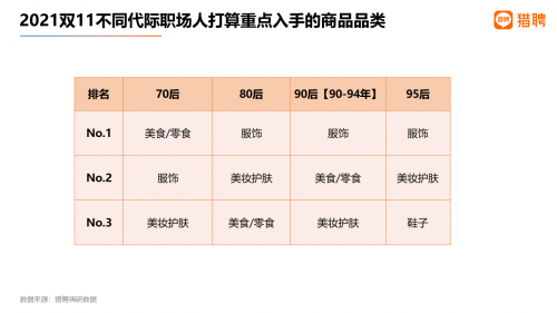 五、70后职场人最爱买美食/零食、80&90后最爱服饰,95后最爱鞋子