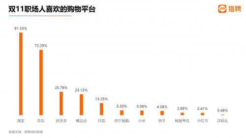 关于双11职场人最喜欢的购物平台,得票率最高的是淘宝,为91.33%;其次是京东,为72.29%。拼多多、唯品会位居第三、第四,得票率为25.78%、23.13%。