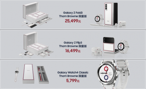 为了让科技与时尚更深层次地融合,并满足众多走在潮流前沿消费者的需求,三星再度携手Thom Browne,为此次推出的三星Galaxy新品附上了更具标志性的外观设计,将工艺品质与视觉品味结合带来的时尚韵味提升到新的高度。无论是白色哑光背板、银色铰链,还是嵌于机身上的Thom Browne标志性色彩元素,均造就了与众不同的时尚品味,为消费者带来只属于三星与Thom Browne的独特气质与鲜明个性。三星Galaxy Z Fold3 5G Thom Browne版建议零售价25,499元,三星Galaxy Z Flip3 5G Thom Browne版建议零售价16,499元,9月8日上午10:08正式开抢,三星Galaxy Watch4 Classic Thom Browne版建议零售价5,799元,将于10月中旬开抢。