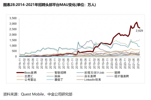 中金报告援引Questmobile数据显示,2021年第二季度BOSS直聘MAU达到3040万。从留存数据来看,根据Quest Mobile数据,短期、中长期留存率方面,2018年以来,BOSS直聘都保持着第一梯队水平。