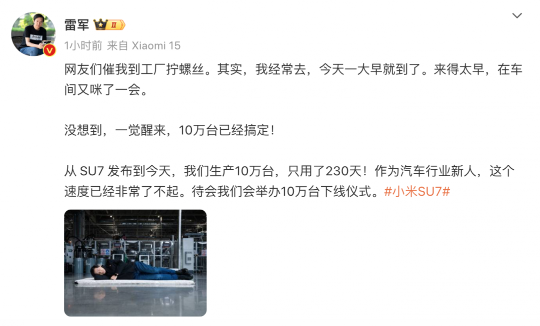 雷军表示,小米SU7发布至今,生产10万台只用了230天。