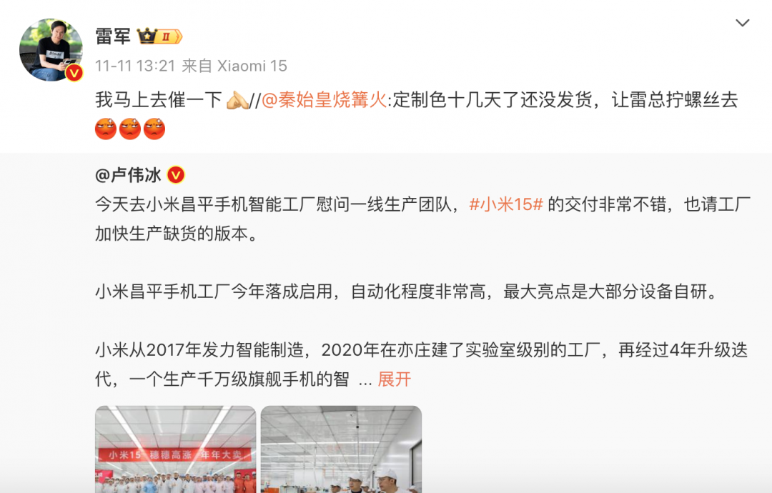 日前,小米总裁卢伟冰发微博称,“小米15的交付非常不错,也请工厂加快生产缺货的版本。”有网友评论称“定制色十几天了还没发货,让雷总拧螺丝去”。雷军很快转发并表示:“我马上去催一下。”