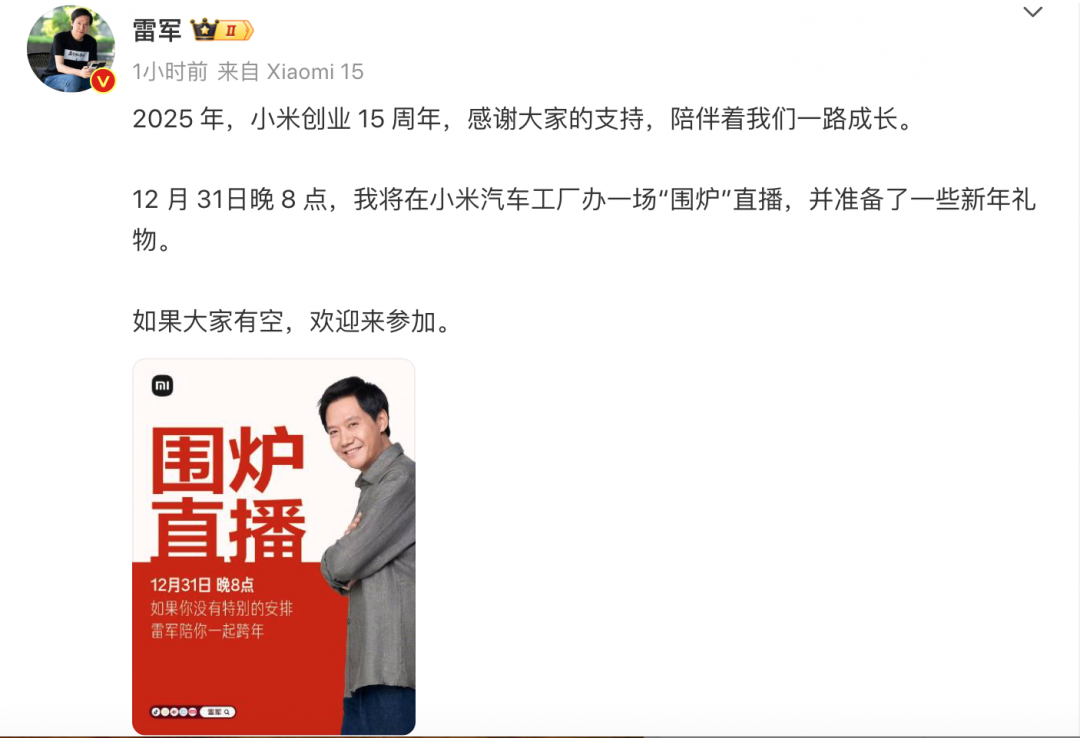 12月30日早间,雷军在个人微博发文称,2025年是小米创业15周年,“12月31日晚8点,我将在小米汽车工厂办一场’围炉’直播,并准备了一些新年礼物。如果大家有空,欢迎来参加。