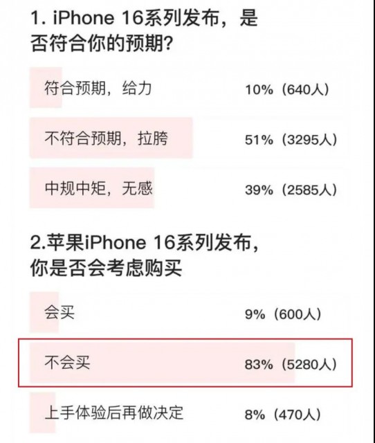 从调查结果来看,有超过半数(51%)的网友认为苹果iPhone16系列新机没有达到预期,甚至拉胯;有39%网友认为新品中规中矩;觉得新机符合预期的占比为10%。