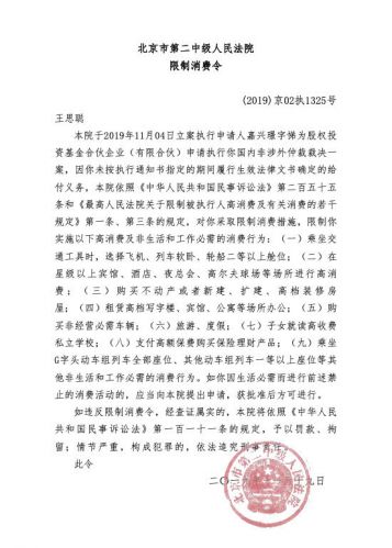 从北京市二中院11月19日向王思聪下达的限制消费令来看,执行申请人为嘉兴璟字悌为股权投资基金合伙企业(有限合伙),申请执行国内非涉外仲裁裁决。
