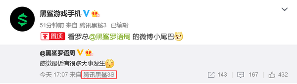 根据黑鲨科技有限公司CEO罗语周最新发布的微博称:“感觉最新有很多大事发生”,开始为自家新机进行预热,而微博的小尾巴更是直接暴露了这款新机的名称:腾讯黑鲨3S,这也是该机以正式身份首次出现在大家眼前。同时从命名来看,该机不仅是前作黑鲨游戏手机3的升级版,将在外观和部分配置上延续前作的设计思路,而且该机同样将与腾讯进行深度合作。