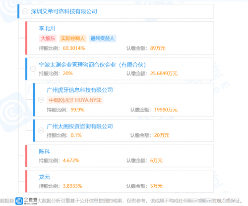 虎牙关联公司投资艾希可洛,后者经营范围含数码科技开发等快报