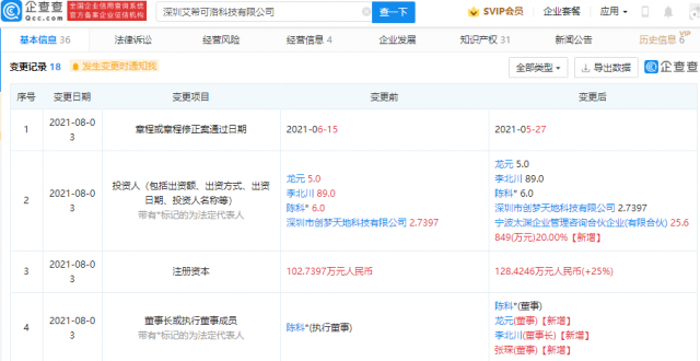 【TechWeb】企查查APP显示,8月3日,深圳艾希可洛科技有限公司发生工商变更,新增股东宁波太渊企业管理咨询合伙企业(有限合伙),后者由广州虎牙信息科技有限公司持股99.90%。