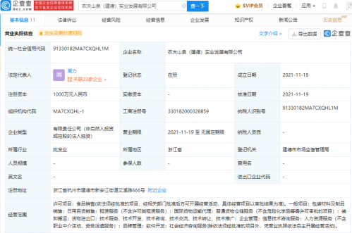 农夫山泉成立实业公司,经营范围含人力资源服务等快讯