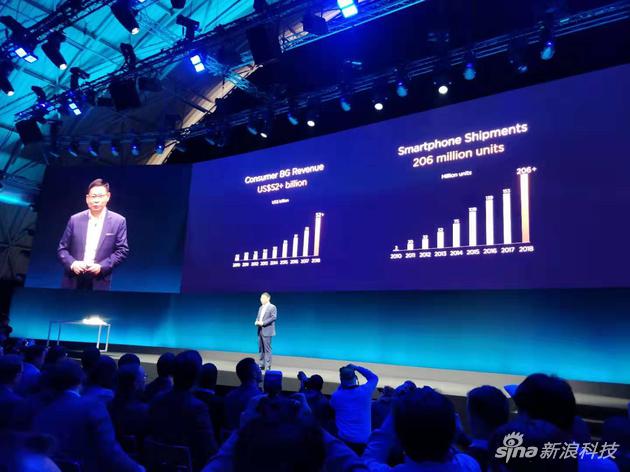 新浪科技讯 2月24日晚间消息,华为终端今日在MWC 2019巴塞罗那世界移动大会上举行发布会,旗下首款折叠屏5G手机亮相。华为消费者业务CEO余承东透露,去年华为收入超过520亿美元,智能手机发货量为2.06亿台,目前排名为全球前二。