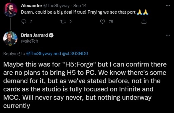 “也许是光环5:Forge吧,我能肯定没有发行《光环5》PC的计划,我们知道有PC爹爹哭着喊着要,但正如之前说过的那样,开发单位目前没这个打算,尤其当前大家都在忙MCC和 无限。不是说永远不可能,但目前确实没这回事。”