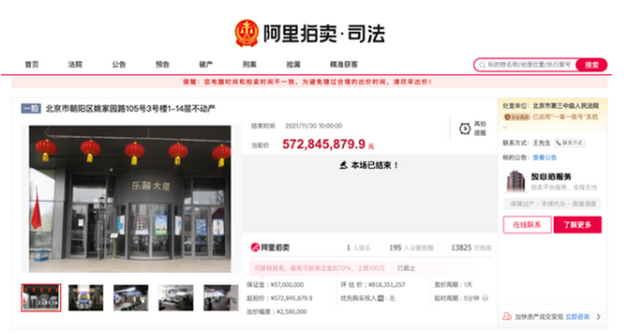 2019年11月,乐视大厦首次进入了司法拍卖程序,当时的评估价为9.69亿元,起拍价为6.78亿元。不过因为“案外人对拍卖财产提出异议”,随即拍卖被叫停。