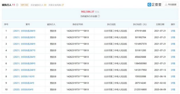 贾跃亭在国内任职的14家企业中,有7家已经注销。他身负27条限制消费令,成为失信被执行人5次,被执行总金额超过90亿元。