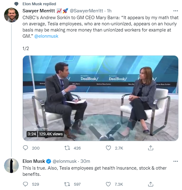 北京时间11月29日上午消息,CNBC记者Andrew Sorkin在采访时表示,根据计算,平均而言,没有工会的特斯拉员工似乎比一些有工会的企业员工(比如通用汽车的员工)赚得更多,马斯克表示确实如此。