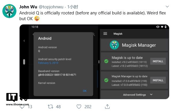 知名Root工具Magisk的开发者John Wu今日在推特上表示,在所有正式版本还没发布之前,Android Q已经被他Root了。晒出的截图显示,他在Pixel 3手机上成功实现了Android Q的Root。