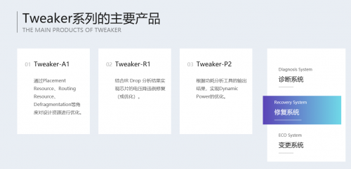 Tweaker的诊断系统(Diagnosis System)能够帮助客户多维度、深层次地分析和评估设计;修复系统(Recovery System)在ECO前可快速高效解决系统的潜在问题,为后续ECO 创造更多的优化空间;变更系统(ECO System)基于ECO domain为客户提供高效、灵活、多样的优化方法,帮助客户显著缩短设计收敛时间。