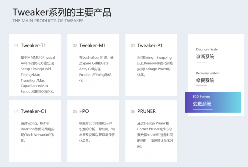变更系统(ECO System)基于ECO domain为客户提供高效、灵活、多样的优化方法,据悉此前新思科技宣布芯行纪将为中国市场提供新思科技的Tweaker系列ECO(Engineering Change Orders)产品,这些功能保证芯片开发者能够在不同设计阶段以更少的迭代、更快的速度和更高的质量实现大规模数字集成电路时序和功耗的ECO收敛。