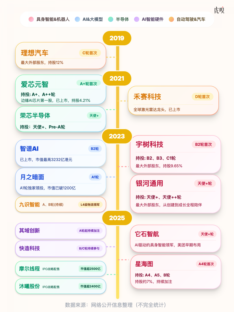 过去五年,美团投资的硬科技公司至少有43家,其中包括28个科技独角兽,涵盖半导体、AI大模型、具身智能与机器人、自动驾驶和智能硬件五大核心赛道,几乎覆盖了AI全产业链。