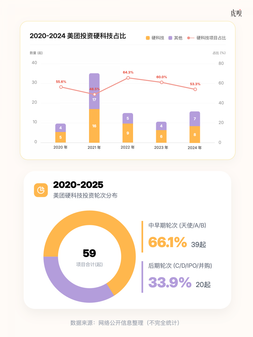 2022年,是互联网企业投资热潮的转折点。这一年,大厂投资数量骤降七成,美团对硬科技的投资量却逆势增长。2020年至2025年5月,美团共参与投资事件89起,其中47笔投向硬科技,其中就包括宇树科技。此外,2022年美团也成立了机器人研究院,致力于无人机、自动驾驶、具身智能等机器人共性关键技术研发。