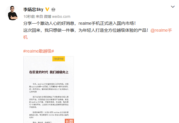 realme 创始人@李炳忠Sky发长微博《在巨变的时代 我们越级向上》,正式宣布realme即将进入国内市场,并在已进入的市场多次打破销售记录。