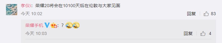 有网友猜测,“荣耀20将会在10100天后在伦敦与大家见面”。