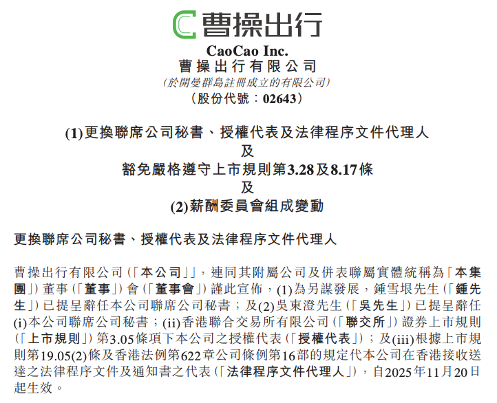 【TechWeb】11月21日消息,曹操出行发布公告显示,钟雪垠先生及吴东澄先生辞任联席公司秘书、授权代表及法律程序文件代理人职务。钟先生及吴先生辞任后,刘俊贤先生已获委任为本公司联席公司秘书,而谭咏子女士已获委任为本公司联席公司秘书、本公司授权代表及法律程序文件代理人,自2025年11月20日起生效。