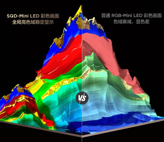 能实现100%BT.2020全局高色域的SQD-Mini LED技术,是行业内画质色彩表现的重大突破,TCL用更具持续性、未来性、前瞻性的方案提出了全新的Mini LED色彩显示方案,突破行业天花板,可以说是将有“原生缺陷”的RGB技术甩得老远。