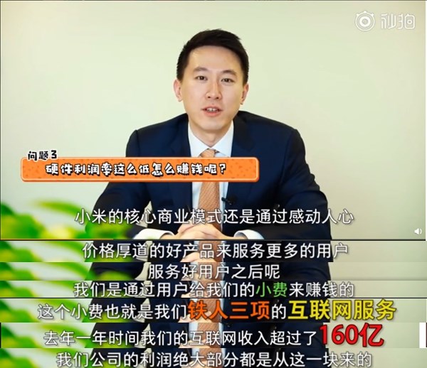 周受资表示,小米的核心商业模式还是通过感动人心、价格厚道的好产品来服务更多的用户,服务好用户之后呢,我们是通过用户给我们的小费来赚钱的,这个小费也就是我们铁人三项的互联网服务。去年一年时间我们的互联网收入超过了160亿元人民币,我们公司的利润绝大部分都是从这一块来的。