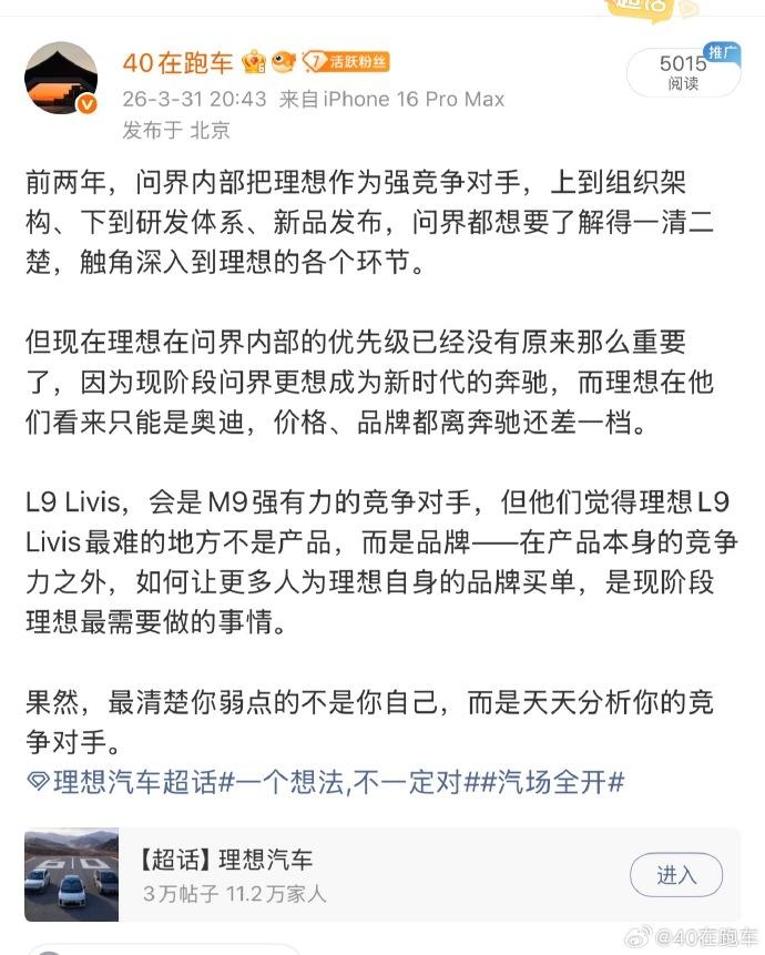 首先上面提到,i6+L6 两款车占了理想近 8 成的销量,这肯定会透支理想的品牌力。从博主「40 在跑车」的调研来看,问界内部已经不再把理想当成最大的对手了,核心就是理想目前的平均车价和品牌更接近奥迪而不是奔驰了。