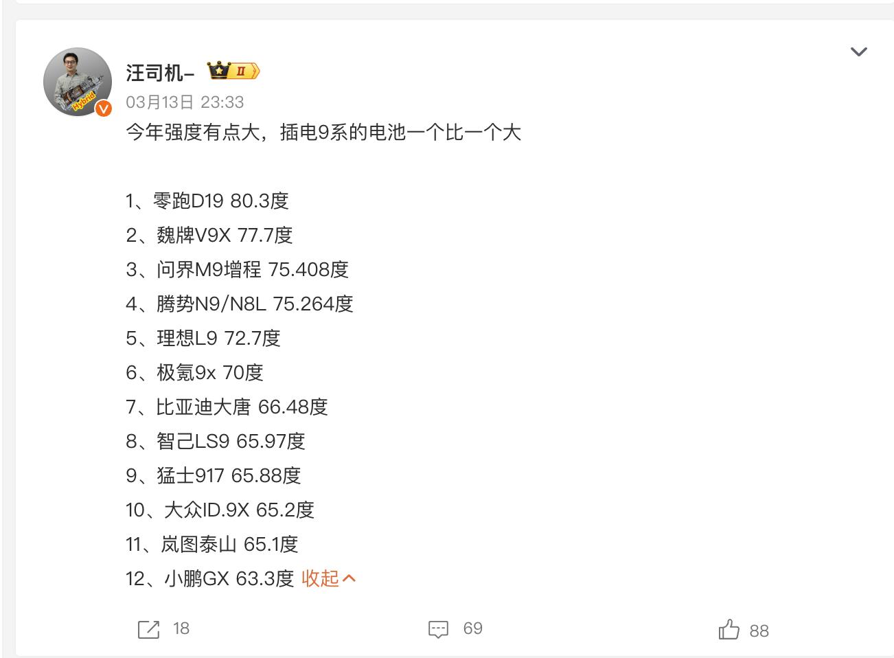 首先来说 72.7 度的 5C 大电池确实优秀,但今年的「9 系大 SUV」普遍也都是 60 度以上的了,很多也支持 5C 甚至腾势还有闪充。