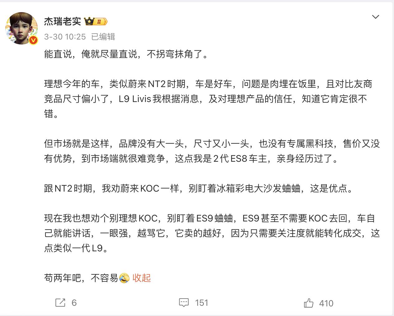 当然理想今年也有很多新车,其中最重磅的无疑是 4 月份的 L9 和下半年的 i9。