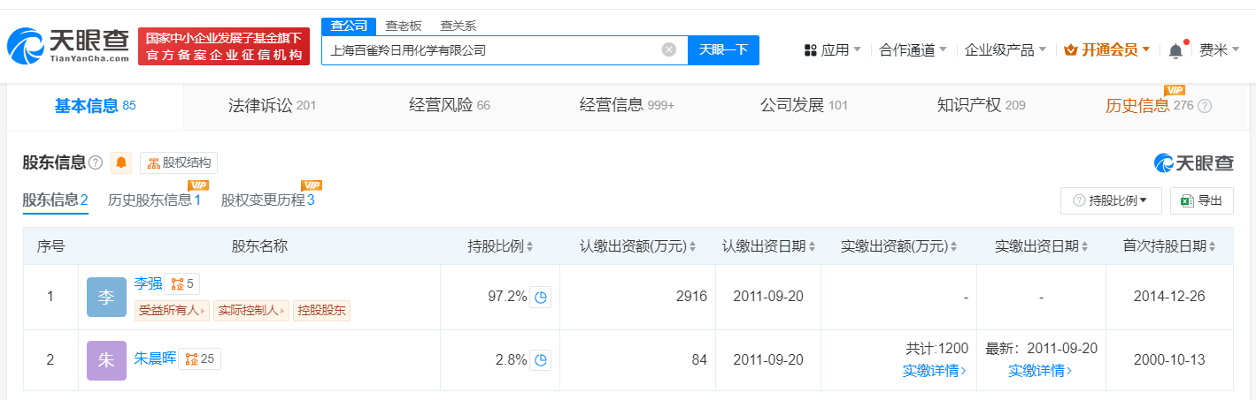 天眼查App显示,上海百雀羚日用化学有限公司成立于2000年10月,法定代表人为李强,注册资本3000万人民币,经营范围含日用化学品的技术开发、技术服务等,由李强、朱晨晖共同持股。公开资料显示,百雀羚创立于1931年,是中国历史最为悠久的著名护肤品牌。