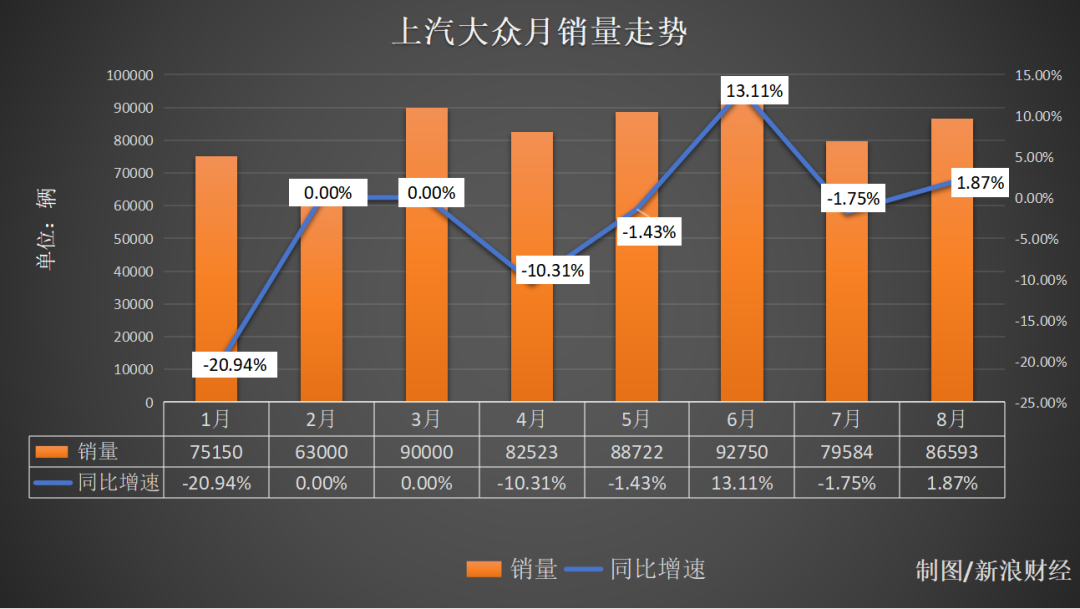 从合资品牌来看,以上汽大众为例,《次世代车研所》栏目梳理发现,今年8个月中,上汽大众仅在今年6月和8月实现了销量增长,其余6个月均处于下滑或者0增长状态;今年上半年,上汽大众销量492145辆,同比下滑3.89%;今年1—8月,上汽大众销量658322辆,同比下滑2.92%。