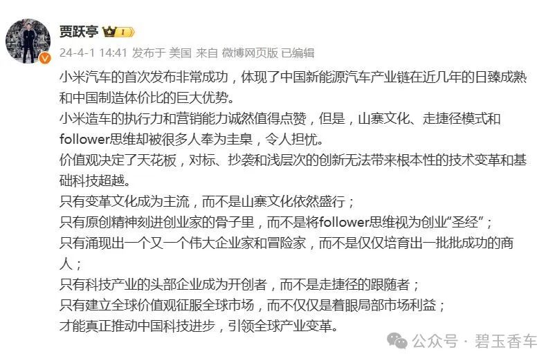 在肯定小米汽车首次发布会非常成功的同时,贾跃亭在微博中也用“上寨文化、走捷径模式和follower思维”等负面词语,点评着小米汽车。他还指出:“价值观决定了天花板,对标、抄袭和浅层次的创新无法带来根本性的技术变革和基础科技超越”。