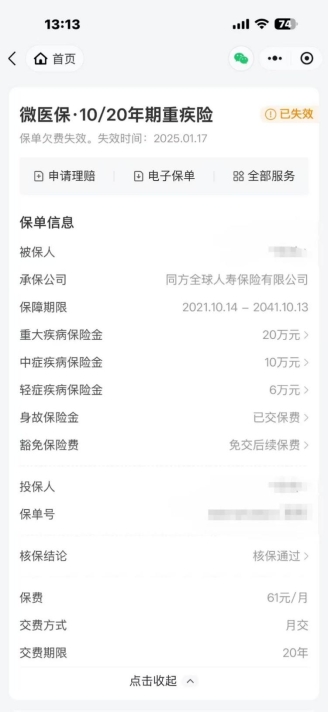 2026年1月,马女士偶然查询保险记录时发现,部分保单已处于失效状态。其回溯交费记录后得知,在投保两年后,平台曾两次出现保费扣缴失败的情况,由于长期未处理,相关保单已过2年复效期,自动失效。其中,两份保费金额较大的“微医保·长期重疾险”和“微医保·10期/20年期重疾险”均在失效名单中。