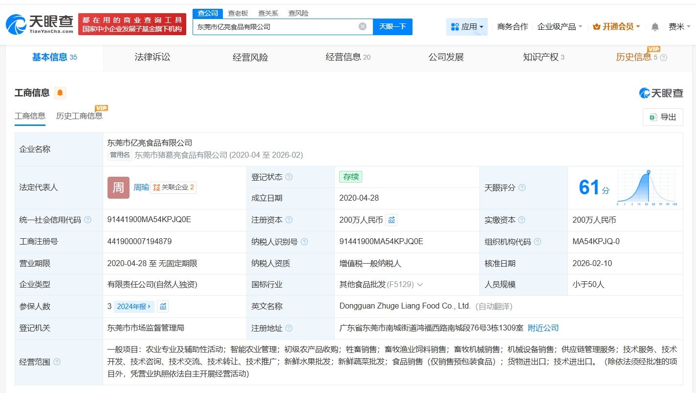 天眼查App显示,近日,东莞市猪葛亮食品有限公司发生工商变更,企业名称变更为东莞市亿亮食品有限公司。