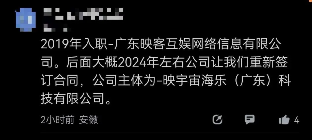 据网友爆料,该员工2019年8月入职广东映客互娱网络信息有限公司(爆料人称该公司系北京映客直播子公司),随后于2024年重新与新的公司主体,“映宇宙海乐(广东)科技有限公司”,签订劳动合同,主要负责社交直播内项目。