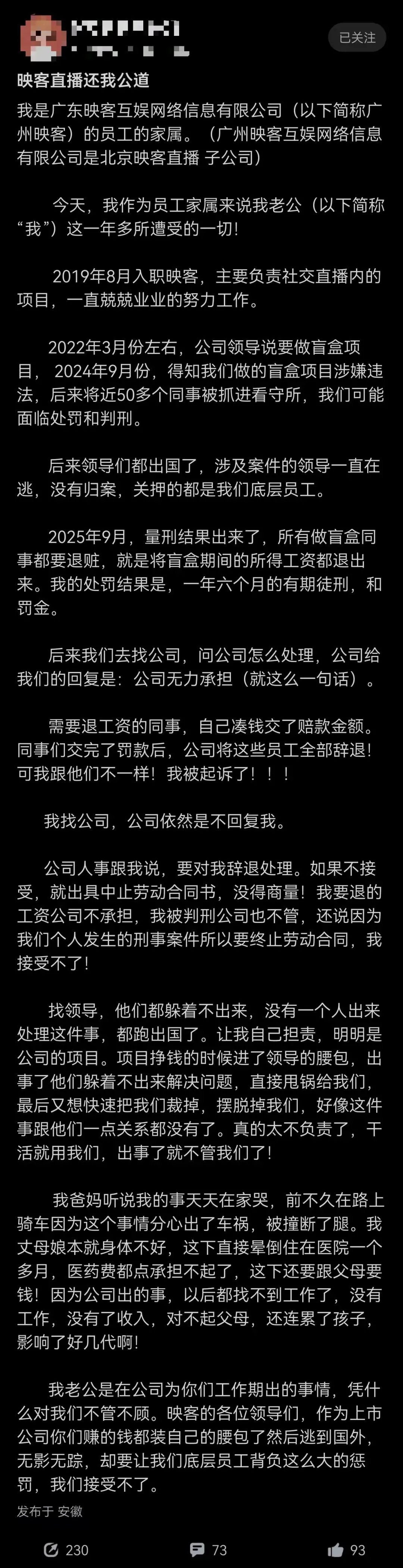 爆料人称,事发后员工们曾咨询公司处理方式,但映客方面回复是“公司无力承担”。