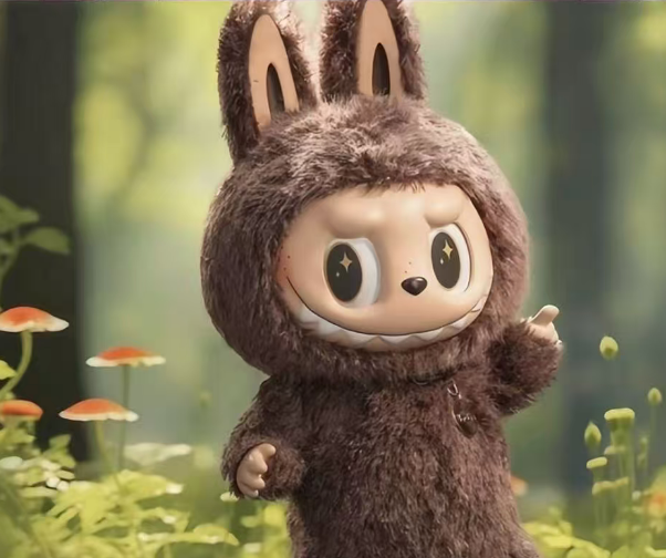 输入视频描述:森林里,阳光透过树叶洒落,镜头缓缓移动,labubu旋转跳跃。