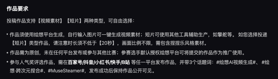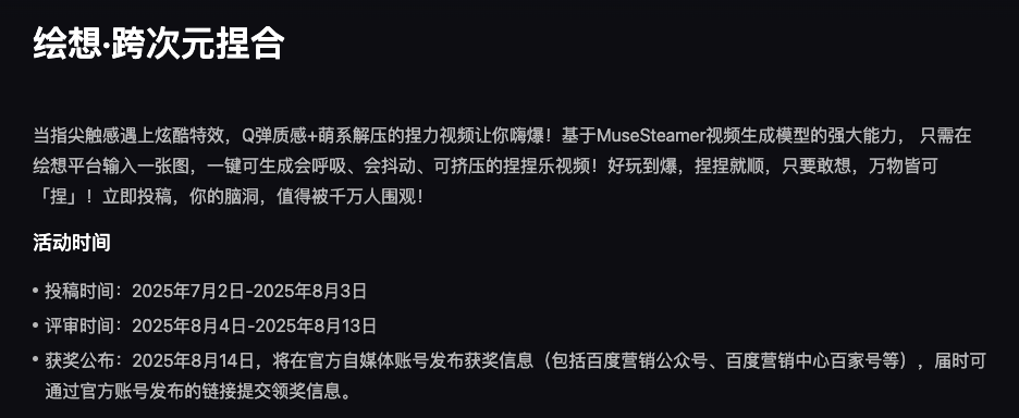 绘想平台还启动了“跨次元捏合”AI视频创作大赛,用户通过单图输入可生成动态捏捏乐视频进行参赛,还有万元大奖等你拿,小伙伴们不妨试试。