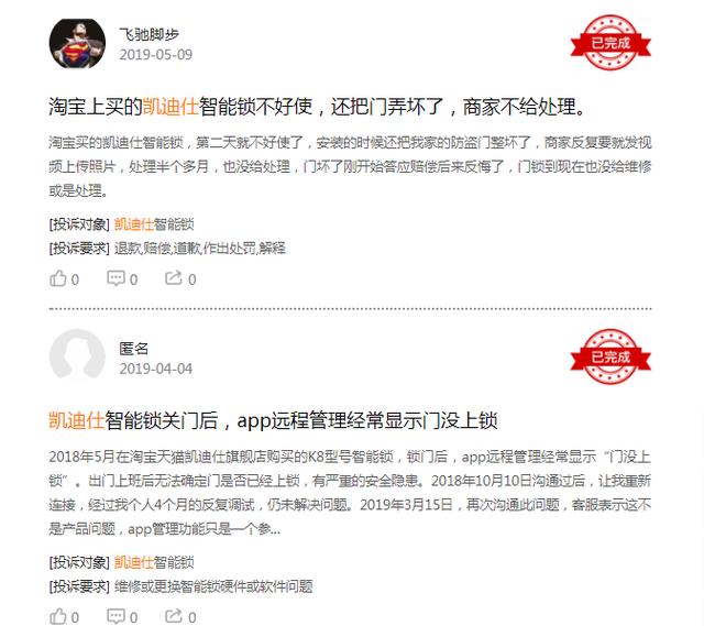 以国内知名智能门锁品牌凯迪仕为例,近期在新浪旗下的黑猫投诉平台上就有多起用户发起售后投诉,其中不乏质量问题以及安全性风险问题。